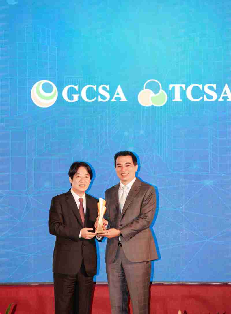 达全方位永续表现获全球永续奖及台湾永续奖肯定,,由副总统赖清德颁奖 (左),,,,尊龙集团总经理柯富仁 (右) 代表领奖